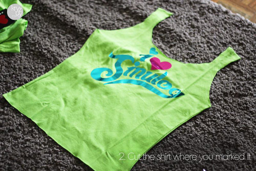 - Cắt chiếc áo thun thành hình áo ba lỗ như thế này